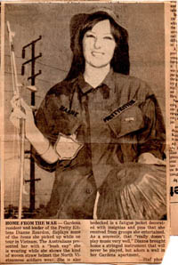 As Cameron was soon to learn, the trip had higher highs and lower lows than she ever could have anticipated. She tells of the Pretty Kittens’ fist day in-country, where the humidity was so severe that their false eyelashes—staples for the era’s female couture—melted from their faces. Their stage costumes suffered the from the same damp mildew as the soldier’s fatigues, aggravated by the lack of a useable laundry. “We had to wash our stage clothes each night, and after so many shows, they began to fall apart. One of the girls had her mother send us over new ones…”